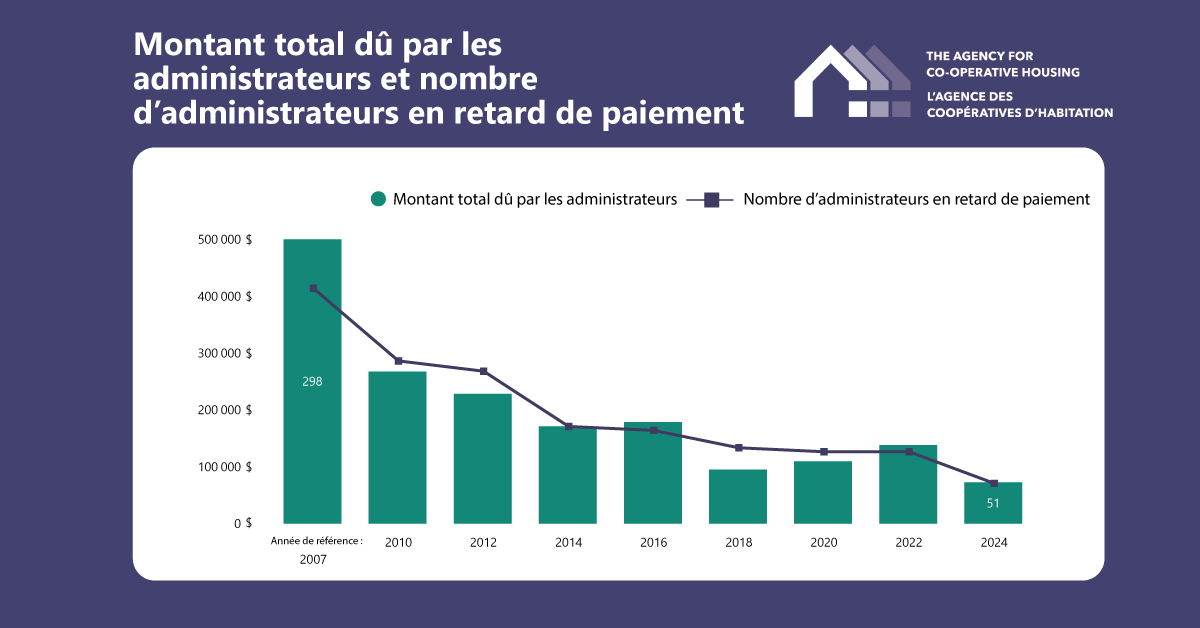 En 2007, 28 % des coopératives ont déclaré avoir des administrateurs qui devaient de l’argent à leur coopérative. Cependant, en 2024, ce nombre a chuté à un niveau historique, avec seulement 51 administrateurs en retard de paiement dans l’ensemble de notre portefeuille, et le montant total dû a diminué de 86 %, passant de plus de 500 000 $ à seulement 72 471 $. Ces données sont déclarées par chaque coopérative cliente de l’Agence le dernier jour de son exercice financier.